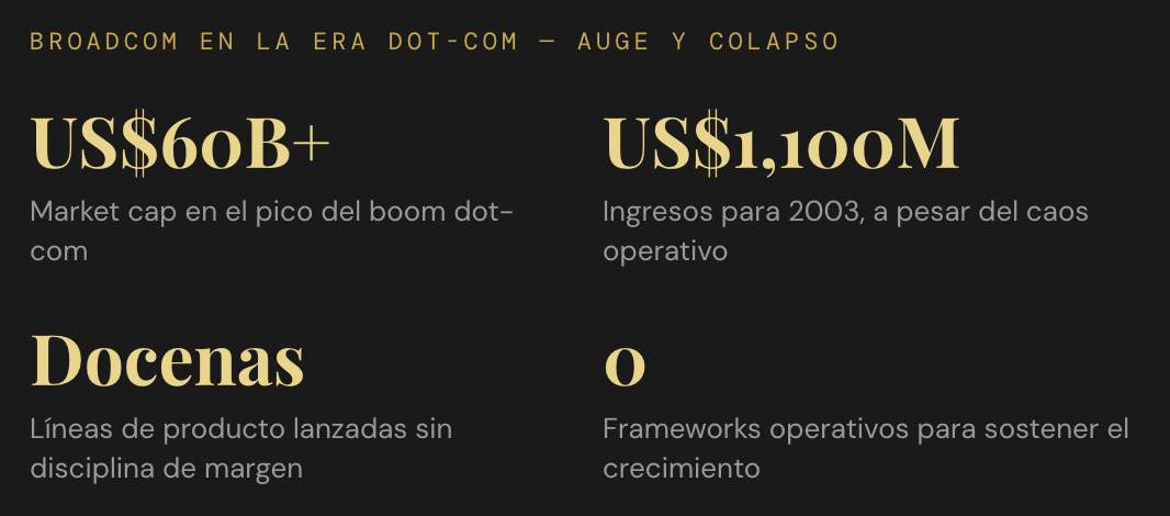 Luego vino el crash. Lo que siguió expuso algo que todavía se subestima en la inversión en tecnología: la excelencia técnica y la disciplina operativa no son lo mismo. Después de 2001, Broadcom perdía margen a chorros. Se había expandido sin control entre líneas de producto. I+D corría sin freno. El negocio generaba ingresos reales, pero quemaba efectivo de maneras que ponían cada vez más nerviosos a los inversionistas institucionales.