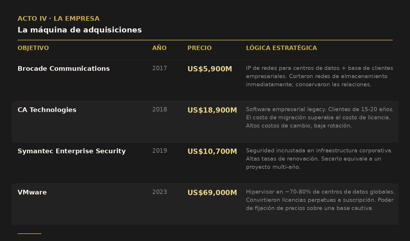 Entre 2017 y 2023, Broadcom ejecutó una de las campañas de M&A más disciplinadas en la historia moderna de la tecnología. La lógica detrás de cada operación fue la misma, y nunca fue sobre innovación.