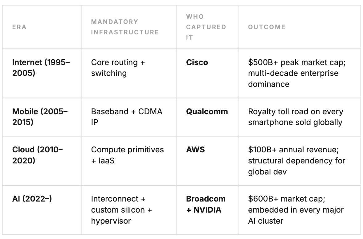 La infraestructura captura consistentemente valor desproporcionado durante las transiciones de plataforma. En el build-out de Internet fue Cisco. En móvil fue Qualcomm. En la nube fueron las primitivas de AWS. La transición de IA producirá su propia capa obligatoria, y Broadcom ya está incrustado en dos de ellas.