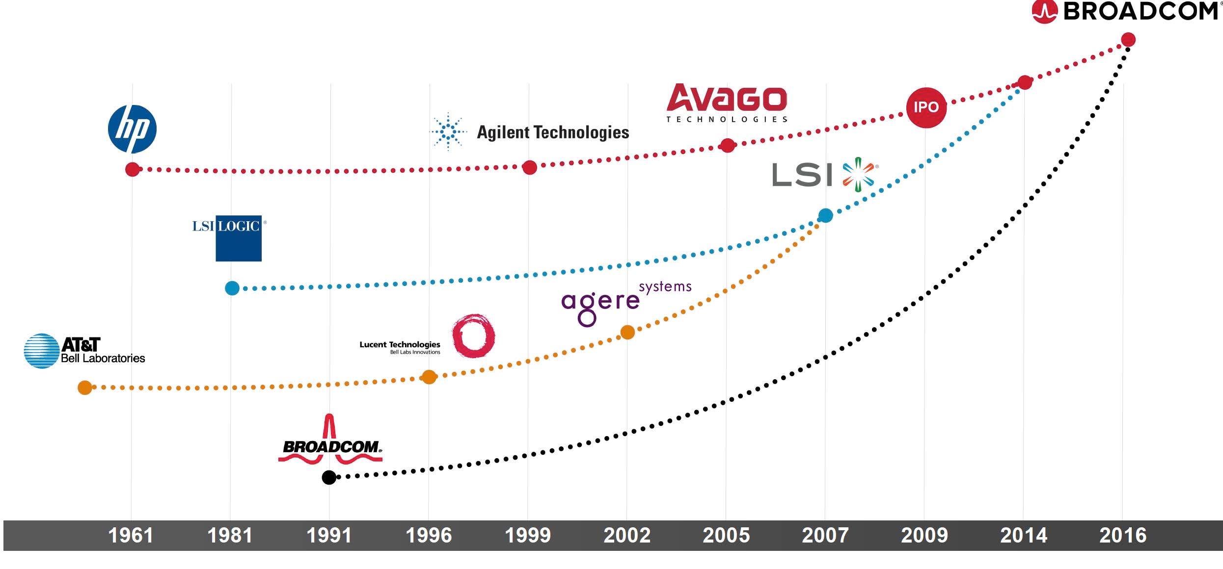 Mayo de 2016. Avago anuncia que adquirirá Broadcom Corporation por US$37 mil millones, en ese momento la adquisición de semiconductores más grande de la historia.